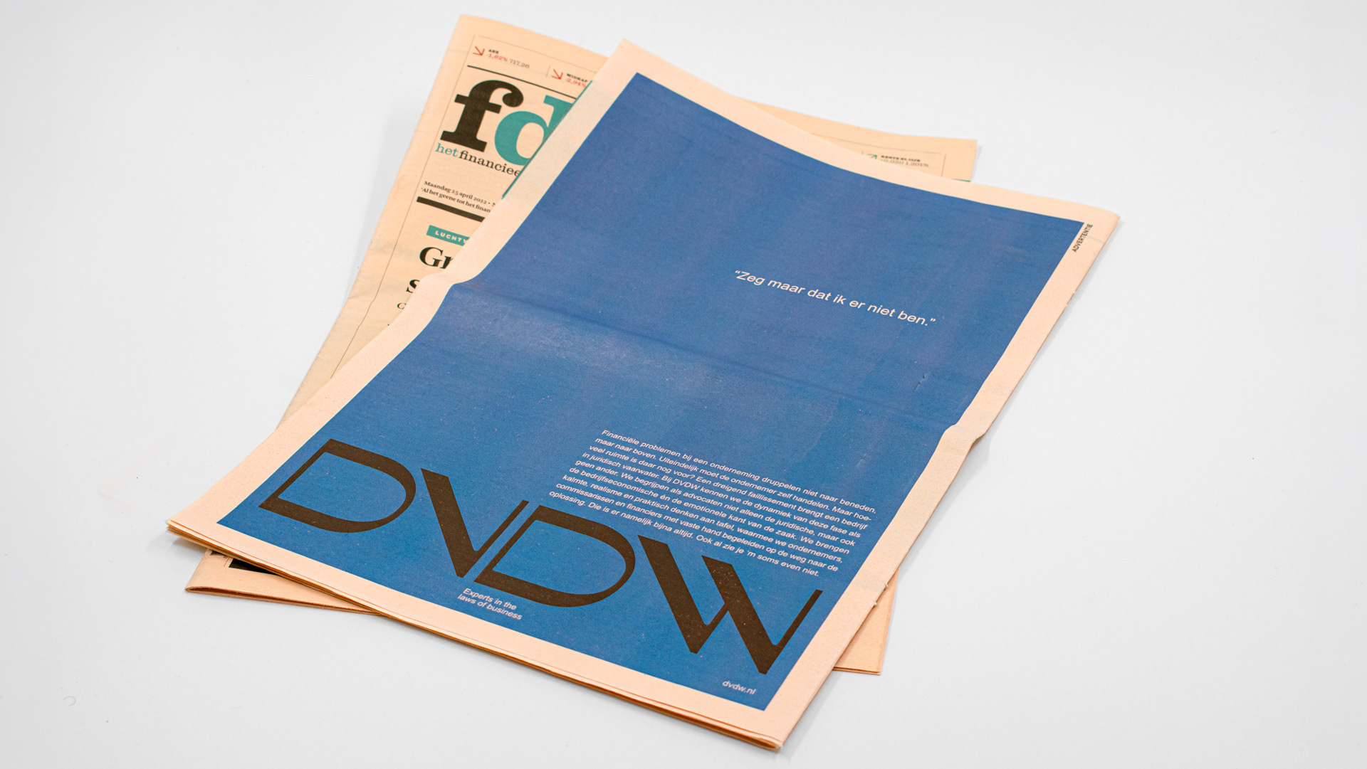 DVDW is een advocatenkantoor dat zich exclusief richt op ondernemers en daarvoor alle relevante disciplines in huis heeft. Het kantoor combineert juridische kennis met inzicht in de ongeschreven wetten van ondernemerschap en zakendoen. Het doel: DVDW bij eigenaren en directies van ondernemingen neerzetten als hét advocatenkantoor voor de midden- en grootzakelijke markt in turbulente tijden.