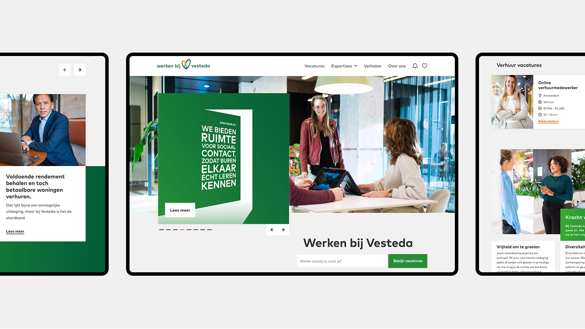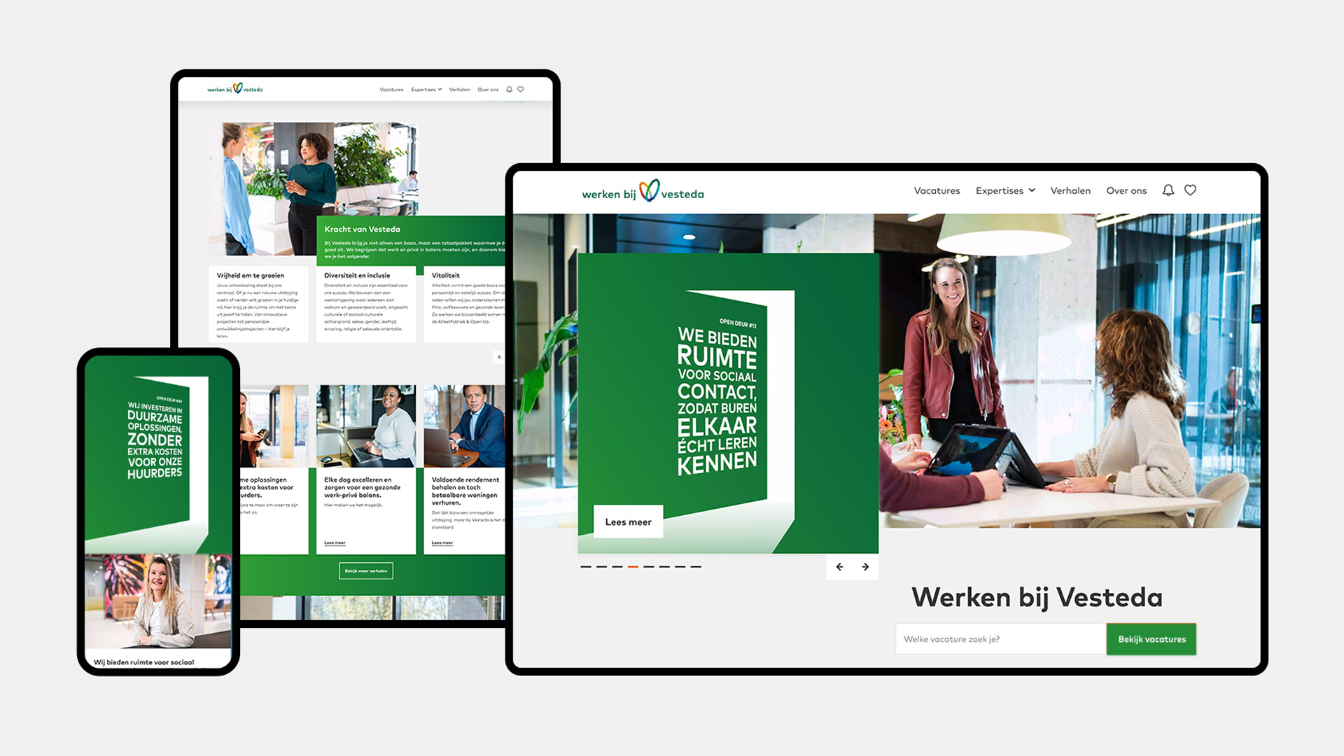 Voor de ‘Werken bij Vesteda’-website was Clubgeist verantwoordelijk voor het concept en de art direction. Daarnaast zorgden we voor een naadloze visuele beleving, waarbij de animaties van open deuren naadloos overliepen in de testimonial video’s.